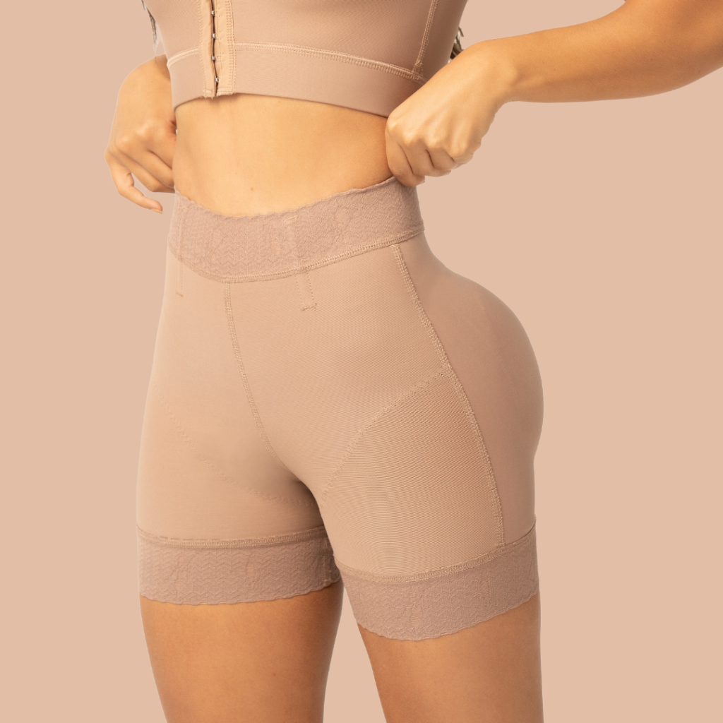 Short style shapewear that flattens your abdomen with its double abdominal reinforcement and gives volume and